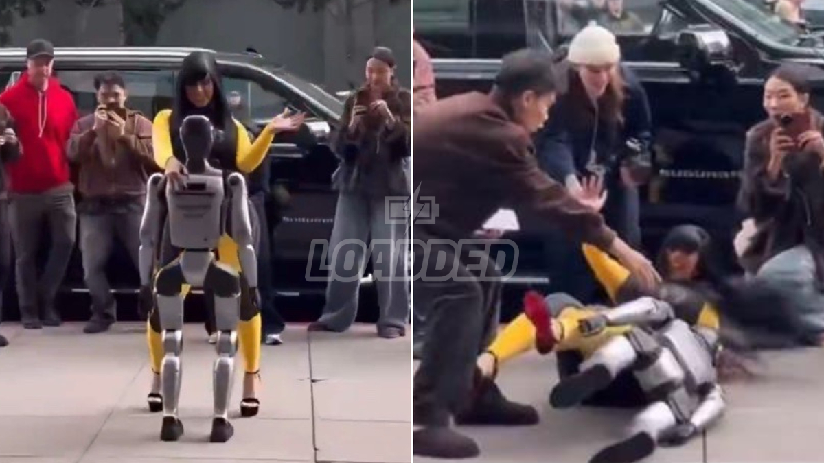 In the now-viral footage shared by several outlets, Cardi B — dressed in a fitted jumpsuit and heels — can be seen circling the robot and playfully teasing it with a mock lap dance, even quipping, “Get away from my man” before the moment went awry. As she continued the dance, the robot suddenly shifted and toppled, causing Cardi B to lose her balance and fall backward onto the ground with the machine momentarily on top of her.